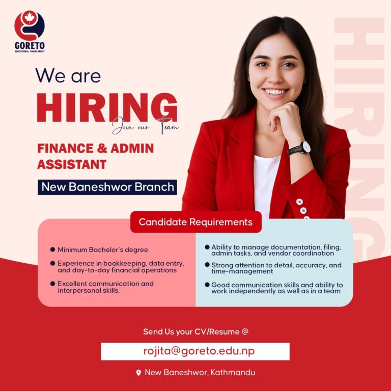 गोरेटो शिक्षा परामर्शले आफ्नो नयाँ बानेश्वरस्थित शाखामा वित्त तथा प्रशासन सहायक पदका लागि योग्य, अनुशासित तथा सक्रिय व्यक्तिहरूबाट आवेदन खुला गरेको छ।